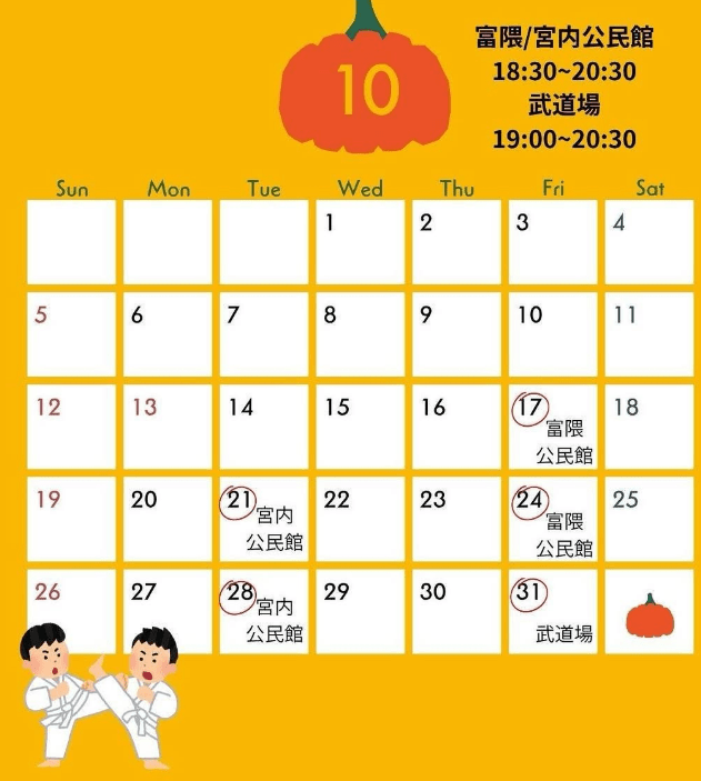 10月は武道館の都合で、練習場所が都度都度変わるので、カレンダーに載せてる場所に来ていただけると幸いで😊